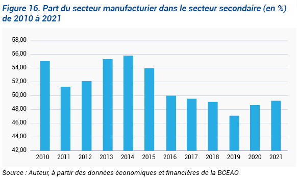 Quant à la part du secteur manufacturier dans le secteur secondaire, elle a connu une évolution en trois phases depuis 2011. La première phase (2011-2014) est caractérisée par un accroissement de sa part dans le secteur secondaire avec un pic de 55,84% en 2014. La deuxième qui part de 2015 à 2019 est marquée par une baisse au niveau du secteur manufacturier dans le secteur secondaire, qui a atteint son plus bas niveau en 2019 (47,12% du secteur secondaire) du fait de la forte orientation des investissements vers le secteur extractif. Puis, une reprise est amorcée en 2020 (48,67%) et s’est poursuivie en 2021 avec une part de 49,28% liée à l’accroissement de la production de pétrole raffiné et des produits alimentaires. La production manufacturière a connu ainsi un accroissement de 8,9% en 2021 contre une baisse de 1,2% en 2020.