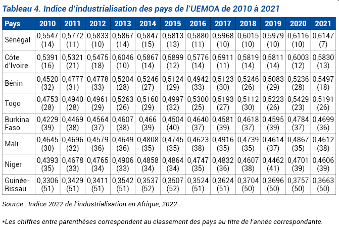 L’analyse de l’évolution de l’indice d’industrialisation permet de suivre l’ensemble des progrès industriels réalisés par les pays. À l’analyse, il ressort que tous les pays de l’UEMOA ont connu une amélioration de leurs indices d’industrialisation de 2010 à 2021. Cet état de fait est dû à une amélioration de l’environnement des affaires, aux politiques de promotion de l’industrialisation à travers les Plans Nationaux de Développement et à l’accroissement des investissements directs étrangers. Cependant, les progrès sont lents. En effet, seuls quatre pays de l’Union (le Sénégal, la Côte d’Ivoire, le Bénin, le Togo) ont obtenu des scores supérieurs à 0,5. Et parmi ces pays, seul le Sénégal est classé dans le quintile supérieur en Afrique en 2021 avec un score de 0,6147, résultat d’une plus grande efficacité dans la mise en œuvre des réformes.