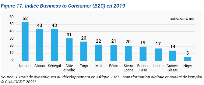 Cependant, l’accès aux infrastructures de communication reste inégal entre les pays de l’Union, réduisant non seulement les gains au niveau des pays, mais également pour l’ensemble de la région, en raison de la difficulté à assurer son interconnectivité numérique. En plus d’une insuffisance de la couverture digitale (réseau téléphonique, accès Internet) dans la majorité des pays, la qualité de la couverture digitale est faible, ne favorisant pas une utilisation optimale. En outre, le coût de l’accès à la connexion Internet est élevé. L’indice Business to Consumer (B2C) indique une faible capacité à réaliser le commerce électronique au sein de l’UEMOA en raison des contraintes sus évoquées. Dans l’UEMOA, les meilleurs scores de l’indice B2C sont de 43 et 31 respectivement au Sénégal et en Côte d’Ivoire.