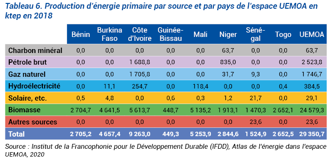 Concernant le type d’énergie produit au sein de l’Union, l’analyse de la répartition de la production d’énergie primaire par pays en 2018, montre que le Niger est le seul producteur de charbon minéral de l’espace. La Côte d’Ivoire est le premier producteur de pétrole brut (66,9%), de gaz naturel (97,6%) et d’hydroélectricité (66,2%) de l’espace. Le Sénégal est le premier producteur d’énergie électrique à partir du solaire photovoltaïque (74,6%) et le seul producteur d’énergie par d’autres sources que celles précédemment citées.