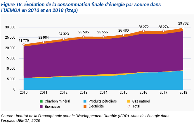 La consommation finale d’énergie de l’espace UEMOA a augmenté de près de 8.000 ktep de 2010 à 2018. Elle est passée de 21.779 ktep (2010) à 29.702 ktep (2018), équivalant à un accroissement moyen annuel de 4,0%. Cependant, l’accès à l’électricité est encore faible et inégalement réparti dans les États membres de l’UEMOA. Seuls la Côte d’Ivoire et le Sénégal ont des parts de ménages électrifiés supérieures à 60%. Le Niger et le Burkina Faso en 2021 sont les pays où l’accès à l’électricité est le plus faible (taux d’accès inférieur à 20%) due notamment à la situation des fournisseurs extérieurs d’électricité, aux crises politiques et sécuritaires que vivent ces pays.