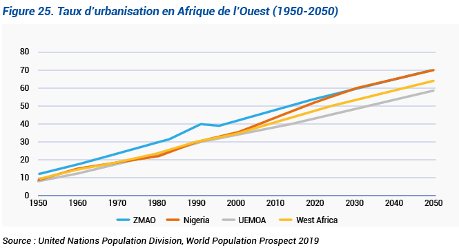 Même si l’urbanisation de l’Union est inférieure à la moyenne en Afrique de l’Ouest en général et particulièrement au Nigeria et dans la zone hors UEMOA (ZMAO), elle affiche une tendance haussière qui constitue une tendance lourde. Cette urbanisation non maîtrisée génère des problèmes importants en termes de besoins en équipements et services essentiels, d’assainissement, d’habitat, d’emploi, en particulier dans les villes capitales qui croissent à un rythme moyen de 6% l’an.