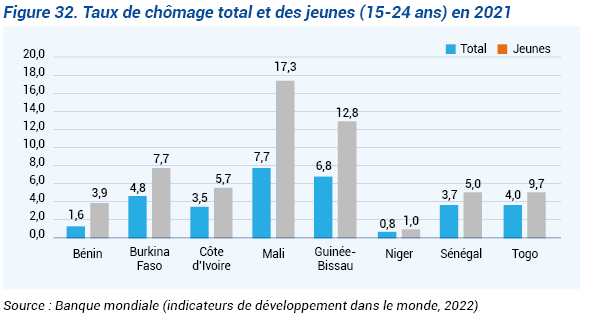 La proportion importante d’enfants et de jeunes est un atout majeur qui peut générer des dividendes démographiques en soutenant l’activité économique et en favorisant la transformation structurelle. Mais elle fait également peser des risques importants d’instabilité au niveau des États membres, en raison notamment des difficultés à satisfaire les besoins importants de cette population jeune, notamment en termes d’éducation, de santé, de logement, d’emploi, etc. Le marché du travail dans l’espace de l’UEMOA est marqué par une forte vulnérabilité de l’emploi et un chômage important chez les jeunes (figure 33). Le taux d’emploi précaire est de 40,9% chez les jeunes contre 25,5% au niveau de l’Union13.