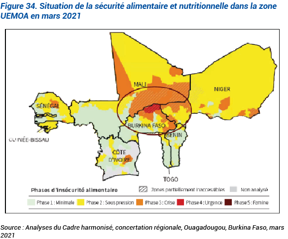 Les huit pays membres de l’UEMOA font face à une crise alimentaire et nutritionnelle majeure. Selon le Cadre harmonisé de mars et juin 2021, à l’entrée de la période de soudure de 2021, l’espace UEMOA comptait 8,1 millions de personnes en besoin d’assistance alimentaire et nutritionnelle d’urgence, comparé à 5,7 millions de personnes en juin-août 2020. La précarité de la situation nutritionnelle dans la plupart des pays sahéliens a été renforcée par l’accès limité aux centres de santé dû à la pandémie de COVID-19 et à la crise sécuritaire.