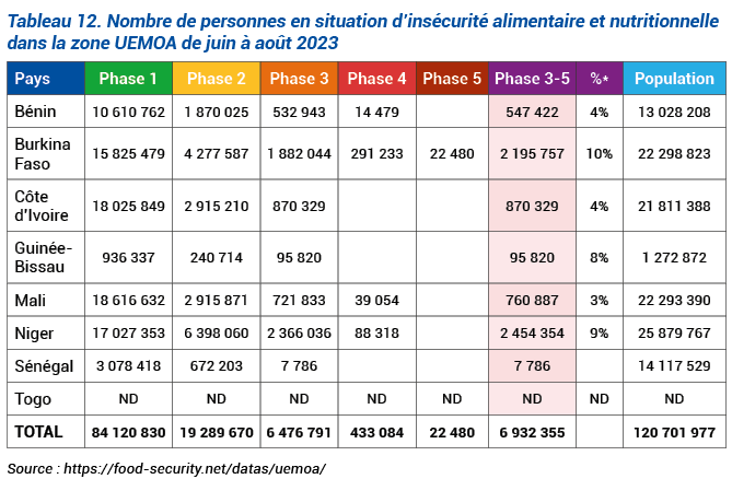 En 2023, 6 932 355 personnes sont touchées par une insécurité alimentaire et nutritionnelle de phase 3, 4 et 5 dans les pays membres (Tableau 12).