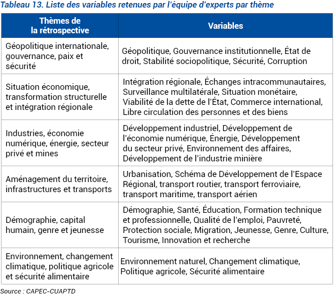 Pour la conduite de l’analyse structurelle, l’équipe d’experts a donc retenu une liste finale de 43 variables21 considérées comme les plus représentatives des six (6) thèmes de la rétrospective. Ces variables sont présentées dans le tableau 13 ci-après :