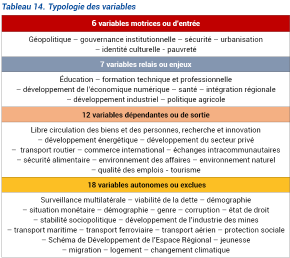 Sur les 43 variables du système, 18 sont des variables autonomes, 12 sont des variables dépendantes, 7 sont considérées comme des variables relais ou enjeux et 6 sont classées dans le cadran des variables motrices (voir tableau de typologie des variables).