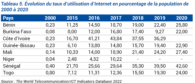 Cependant, l’accès aux infrastructures de communication reste inégal entre les pays de l’Union, réduisant non seulement les gains au niveau des pays, mais également pour l’ensemble de la région, en raison de la difficulté à assurer son interconnectivité numérique. En plus d’une insuffisance de la couverture digitale (réseau téléphonique, accès Internet) dans la majorité des pays, la qualité de la couverture digitale est faible, ne favorisant pas une utilisation optimale. En outre, le coût de l’accès à la connexion Internet est élevé. L’indice Business to Consumer (B2C) indique une faible capacité à réaliser le commerce électronique au sein de l’UEMOA en raison des contraintes sus évoquées. Dans l’UEMOA, les meilleurs scores de l’indice B2C sont de 43 et 31 respectivement au Sénégal et en Côte d’Ivoire.
