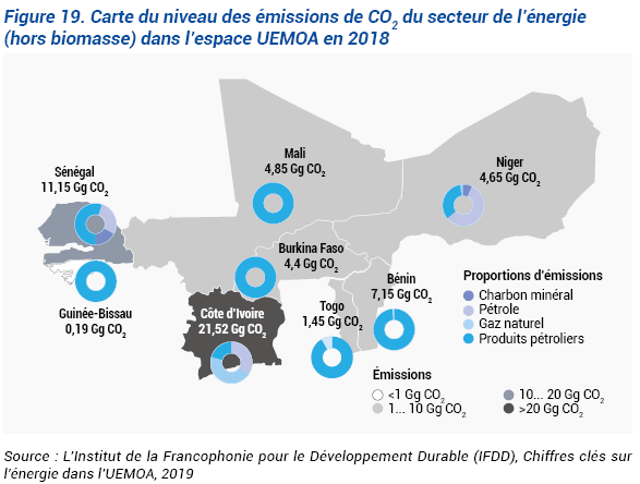 Par rapport à la pollution, les émissions de CO2 de l’espace UEMOA connaissent une hausse moyenne annuelle de 6,0%. En 2018, les pays ayant émis les niveaux les plus importants de CO2 sont la Côte d’Ivoire, le Sénégal et le Bénin du fait du niveau relativement élevé du processus d’industrialisation dans l’Union. Les produits pétroliers ont été à l’origine de 63% des émissions de CO2 de l’espace UEMOA. Cependant, globalement, le niveau d’émission de CO2 de l’Union reste infime comparé aux niveaux enregistrés dans les pays développés tels que la de Chine, les États-Unis, etc.