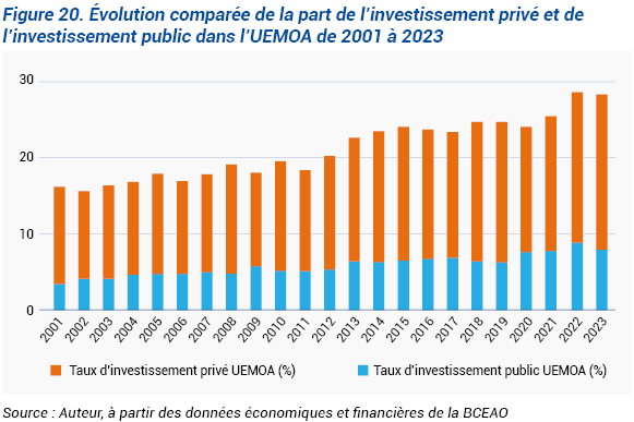 L’investissement privé est la composante principale de l’investissement dans l’Union. Il représente plus des deux tiers des investissements totaux de l’UEMOA. Le taux d’investissement privé est en hausse sur la période 2001-2023, passant de 12,70% à 20,30% en 2023. Cette hausse est imputable à une combinaison de facteurs dont l’amélioration globale du climat des affaires, la hausse des crédits accordés aux entreprises du secteur productif orientés à 49% vers l’industrie extractive (base de données économiques et financières de la BCEAO).