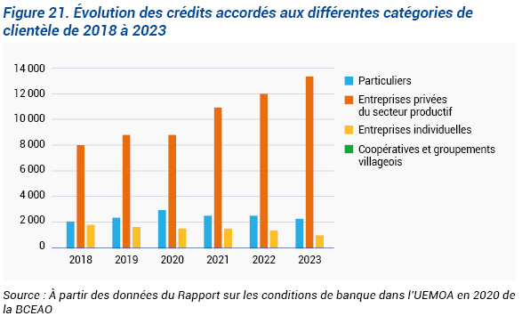 Concernant les crédits accordés au secteur privé, les données disponibles sur la période 2018 à 2023 suggèrent une progression. Cependant, les crédits octroyés aux entreprises individuelles stagnent (figure 21).