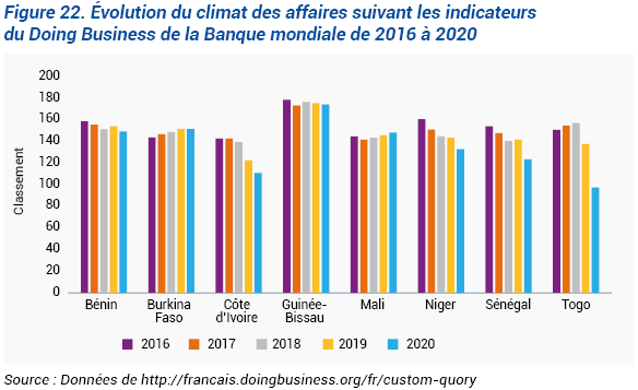 La progression des investissements au sein de l’UEMOA résulte en partie des progrès enregistrés dans plusieurs États concernant le climat des affaires. En effet, les scores obtenus pour les indicateurs du Doing Business de la Banque mondiale ont progressé dans la majorité des États. Néanmoins, les performances restent faibles et les pays de l’Union se classent généralement au-delà du 100e rang, à l’exception du Togo qui est classé à la place 97e sur 190 au Doing Business 2020.