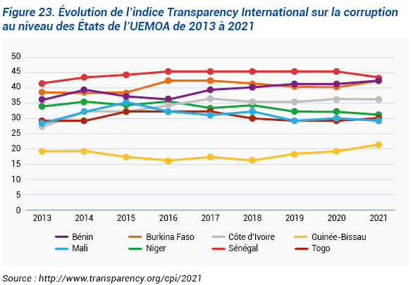 La qualité de l’environnement des affaires est également compromise par les pratiques de corruption récurrentes au sein de l’Union en dépit des progrès enregistrés au cours des cinq dernières années. Les pays de l’Union affichent dans l’ensemble des scores inférieurs à 50, sur une échelle de 0 (niveau le plus élevé de corruption) à 100 (absence de corruption) concernant l’indice de Transparency International sur la corruption.