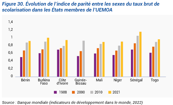 S’agissant du secteur de l’éducation, des progrès considérables ont été également enregistrés dans l’ensemble des États membres depuis le début des années 1990. Le nombre moyen d’années d’éducation a progressé au fil des années dans l’ensemble des États et les inégalités, entre les sexes, dans l’accès à l’éducation, ont été considérablement réduites, notamment dans le primaire. À titre illustratif, l’indice de parité entre les sexes du taux brut de scolarisation s’est amélioré dans tous les pays de l’Union (figure 30).