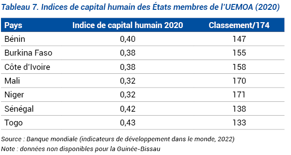 En dehors des efforts réalisés au niveau de l’UEMOA, des initiatives sont également prises au niveau régional, notamment par la CEDEAO et l’Union Africaine et au niveau international, par les partenaires, en vue du relèvement du niveau du capital humain sur le continent. Dans ce cadre, la CEDEAO s’est dotée, en juillet 2021, d’une stratégie de développement du capital humain fondée sur l’éducation, le développement des compétences et le travail. Ladite stratégie ambitionne d’améliorer, d’ici à 2030, le stock de capital humain disponible dans la sous-région ouest-africaine.