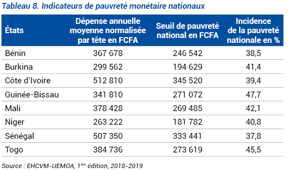 S’agissant de l’état de la pauvreté dans l’Union, les résultats de l’Enquête Harmonisée sur les Conditions de vie des Ménages (EHCVM) de 2018-2019 indiquent que son incidence varie de 37,8% au Sénégal, niveau le plus faible, à 47,7% en Guinée-Bissau, taux le plus élevé. Ainsi, au moins un habitant sur trois dans chaque État membre vit en dessous du seuil de pauvreté national (tableau 8).