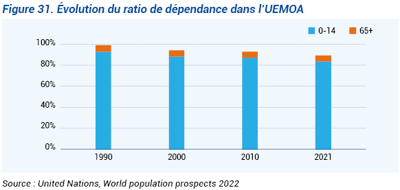 Le profil démographique de l’UEMOA est caractérisé par une population jeune avec un âge médian de 17 ans. 44,3% de cette population a moins de 15 ans et 64,2% moins de 25 ans. Le ratio de dépendance démographique est de 89% en 2021 contre 83% pour l’Afrique subsaharienne (ASS). Il indique qu’une personne active vivant dans l’Union, dont l’âge est compris entre 15 et 64 ans, a à sa charge 0,89 personne contre 0,83 en ASS.
