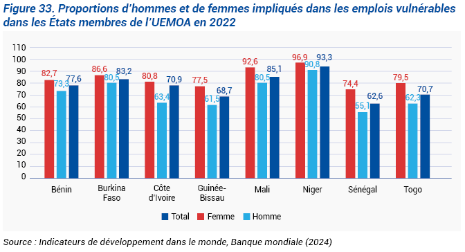 La proportion importante d’enfants et de jeunes est un atout majeur qui peut générer des dividendes démographiques en soutenant l’activité économique et en favorisant la transformation structurelle. Mais elle fait également peser des risques importants d’instabilité au niveau des États membres, en raison notamment des difficultés à satisfaire les besoins importants de cette population jeune, notamment en termes d’éducation, de santé, de logement, d’emploi, etc. Le marché du travail dans l’espace de l’UEMOA est marqué par une forte vulnérabilité de l’emploi et un chômage important chez les jeunes (figure 33). Le taux d’emploi précaire est de 40,9% chez les jeunes contre 25,5% au niveau de l’Union13.