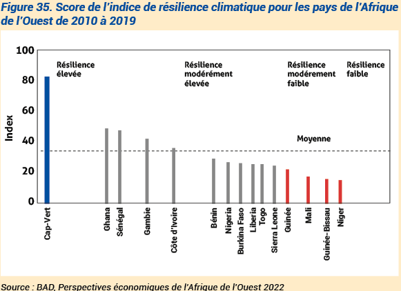 Selon l’Indice de résilience climatique pour l’Afrique, calculé dans le rapport sur les Perspectives économiques en Afrique de l’Ouest 2022, entre 2010 et 2019, les trois pays de l’UEMOA les moins résilients sont le Niger, la Guinée-Bissau, le Mali (BAD, 2022). Selon la même étude de la BAD (Perspectives économiques de l’Afrique de l’Ouest 2022), le Sénégal est le pays le plus résilient de la zone UEMOA face aux chocs climatiques.