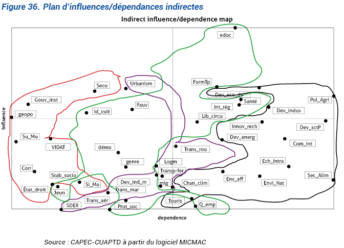 Le classement opéré, à partir du logiciel MICMAC, a permis d’identifier des messages clés dont le dénouement ou non va conditionner l’évolution du système. Ces messages sont principalement décryptés par l’interprétation faite du positionnement des variables dans les plans influence-dépendance indirecte et indirecte potentielle. Les principaux résultats ou enseignements à tirer de cette étape de la réflexion prospective sont présentés ci-après :