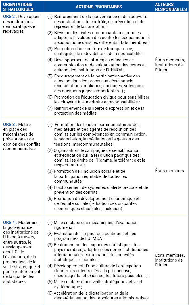 L’examen de l’expérience des pays qui réalisent des progrès importants en matière économique et sociale montre que ceux-ci forgent des institutions de qualité et respectent les droits humains et les libertés individuelles, gages de paisibilité et de stabilité. S’inspirant de ces modèles de réussite, l’UEMOA devra œuvrer, au cours des 17 prochaines années, à la consolidation et à la modernisation de ses institutions, y compris les institutions démocratiques, au renforcement de la gouvernance, des mécanismes de prévention et de gestion des conflits et de la sécurité interne.